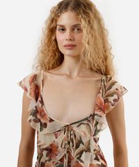 Vestido curto feminino confeccionado em tecido plano texturizado com estampa floral e fios de lurex que acrescentam brilhos. A peça tem modelagem evasê e caimento solto ao corpo. O modelo tem decote decote arredondado, tiras finas decorativas e alças finas com babados aplicados. Possui forro em malha e acabamento pespontado na barra.