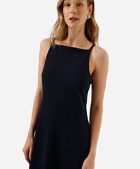 Vestido feminino confeccionado em tecido de alfaiataria com toque leve. A peça possui modelagem reta com caimento levemente solto, comprimento curto, decote quadrado, alças finas, detalhe de recorte, fechamento posterior por zíper invisível e acabamentos pespontado.