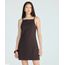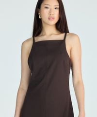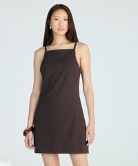 Vestido feminino confeccionado em tecido de alfaiataria com toque leve. A peça possui modelagem reta com caimento levemente solto, comprimento curto, decote quadrado, alças finas, detalhe de recorte, fechamento posterior por zíper invisível e acabamentos pespontado.