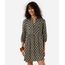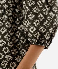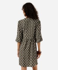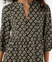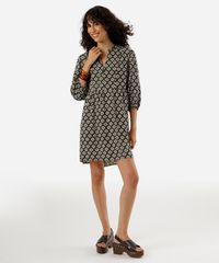 Vestido curto feminino confeccionado em tecido plano de viscose com estampa étnica. A peça tem modelagem evasê, caimento amplo e solto ao corpo com recorte inferior formando franzidos. O modelo tem decote v, fechamento por botões e mangas 3/4 com elástico embutido nos punhos. Detalhe de acabamento pespontado na barra.