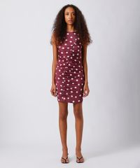 Vestido curto feminino confeccionado em malha com estampa poá. A peça tem modelagem reta, caimento ajustado ao corpo e franzido diagonal. O modelo tem decote redondo e alças largas. Detalhe de acabamento pespontado na barra.
