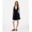 Vestido curto feminino confeccionado em jeans estruturado. A peça tem modelagem evasê, caimento acinturado e solto ao corpo com recorte verticais. O modelo tem decote V frente única, alças médias e fechamento por zíper posterior.
