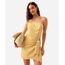 Vestido curto confeccionado em tecido plano com linho e estampa listrada com recorte posterior liso. O modelo tem modelagem ombro único, caimento acinturado com sobreposição frontal e amarração lateral. O modelo tem decote diagonal e alça e fechamento lateral por zíper.