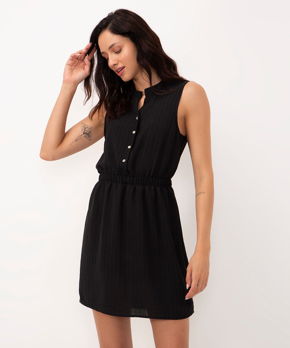 vestido curto texturizado com elástico e botões preto