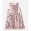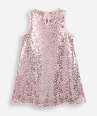 Vestido infantil confeccionado em tecido sintético revestido por paetês em formato de flor. Possui modelagem evasê, caimento levemente solto, gola redonda, design sem mangas com cavas levemente amplas, forro em tecido macio e fechamento posterior com botão.