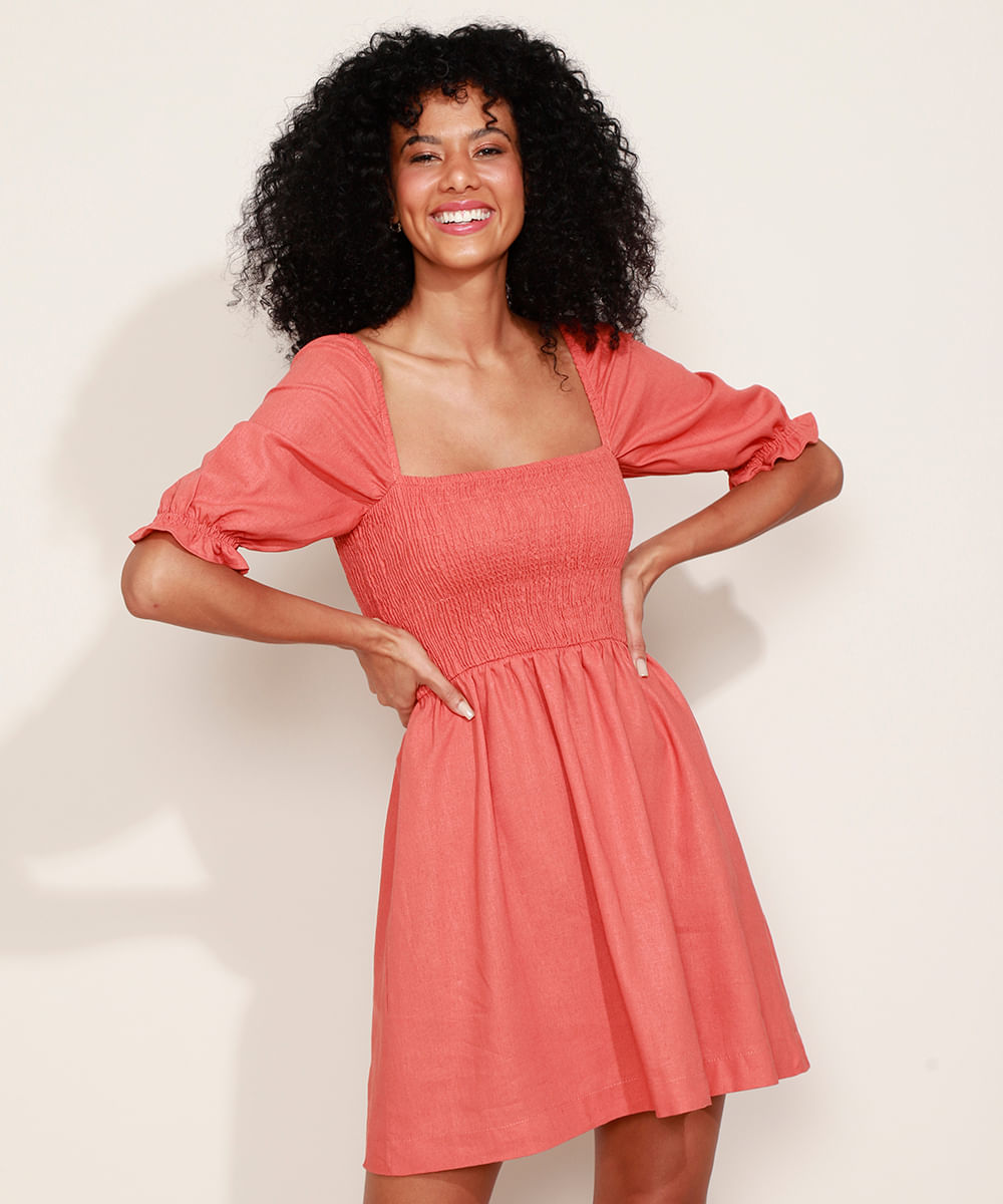 Este vestido curto é a escolha ideal para quem busca um visual romântico e atual. Com um design que valoriza o conforto, a peça combina o charme das mangas bufantes com a praticidade do corpo em lastex, que se ajusta perfeitamente. Confeccionado em tecido plano com linho, possui um toque agradável e caimento leve, sendo um item versátil para compor looks cheios de personalidade.