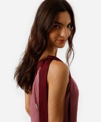 Vestido feminino confeccionado em tule. A peça possui caimento reto e solto, comprimento longo, gola ombro único com faixa de amarração, forro, estampa localizada floral, e acabamento corte à fio na barra.