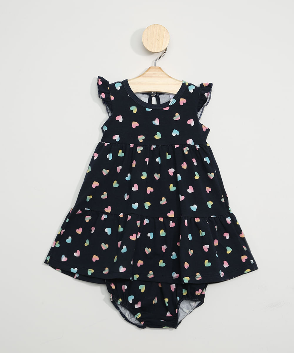 Vestido infantil confeccionado em malha estampada de corações. O modelo tem decote redondo, sem mangas com aplicação de babados. Possui recortes conferindo caimento soltinho. O fechamento é posterior por botão. Acompanha calcinha.