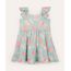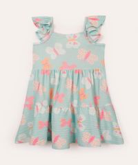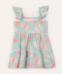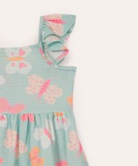 Vestido confeccionado em malha texturizada com estampa de borboletas. A peça possui alças finas com detalhes de babados aplicados, caimento evasê, comprimento midi, recortes maria franzidos na saia e acabamento pespontado.