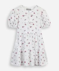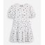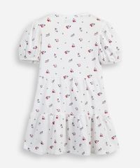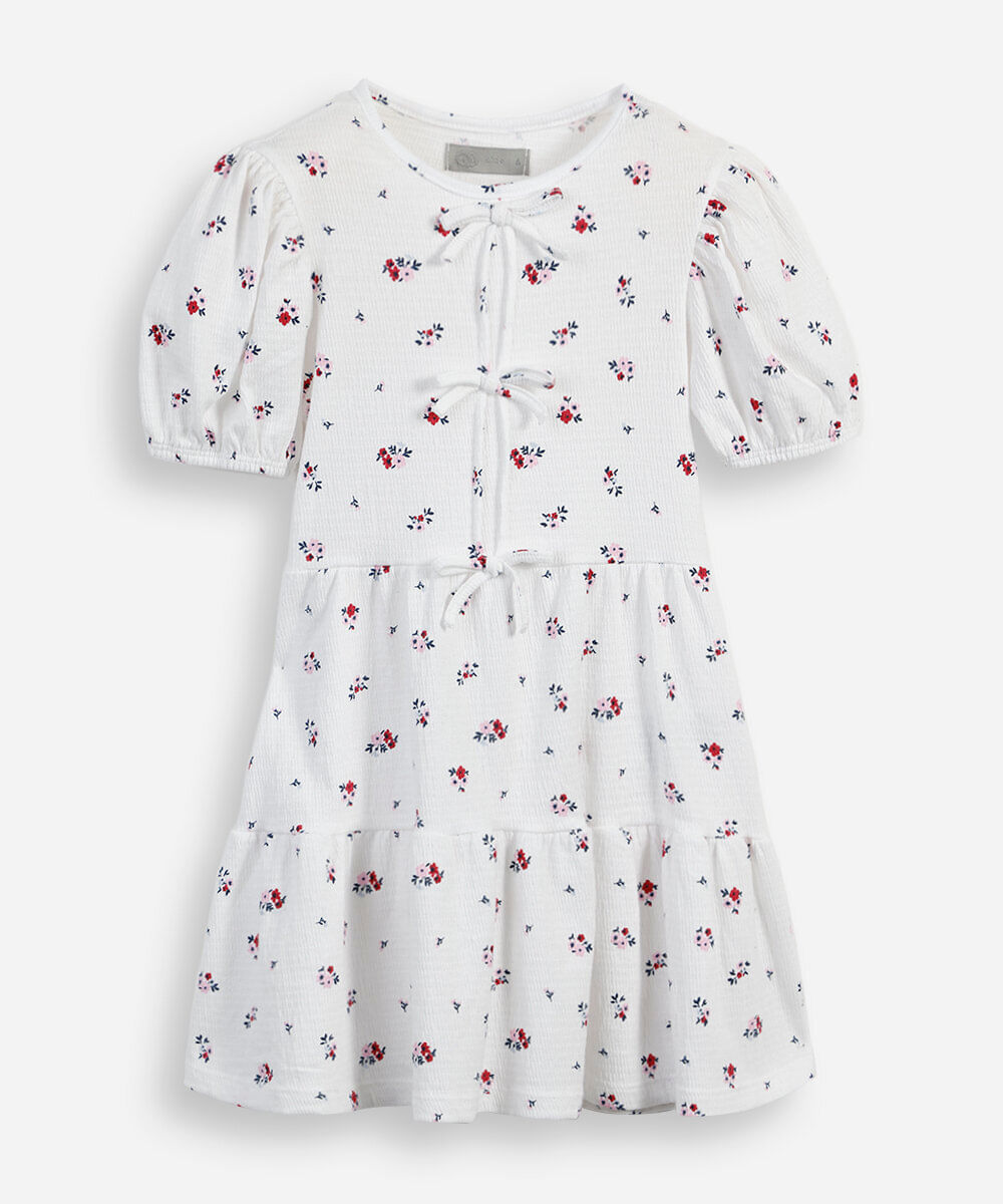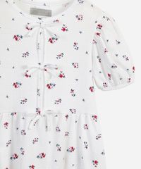 Vestido infantil confeccionado em malha texturizada com algodão e estampa floral. A peça tem modelagem evasê, caimento solto ao corpo com recorte inferior formando franzidos. O modelo tem decote redondo, laços decorativos e mangas curtas com elástico nos punhos. Detalhe de acabamento pespontado na barra.
