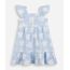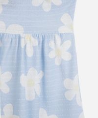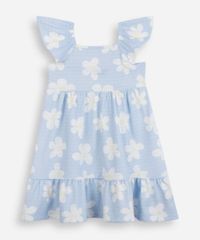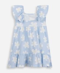 Vestido infantil confeccionado em malha texturizada com algodão e estampa floral. A peça tem modelagem evasê, caimento rodado e solto ao corpo com recorte na barra. O modelo tem decote quadrado e alças elásticas com babados aplicados.