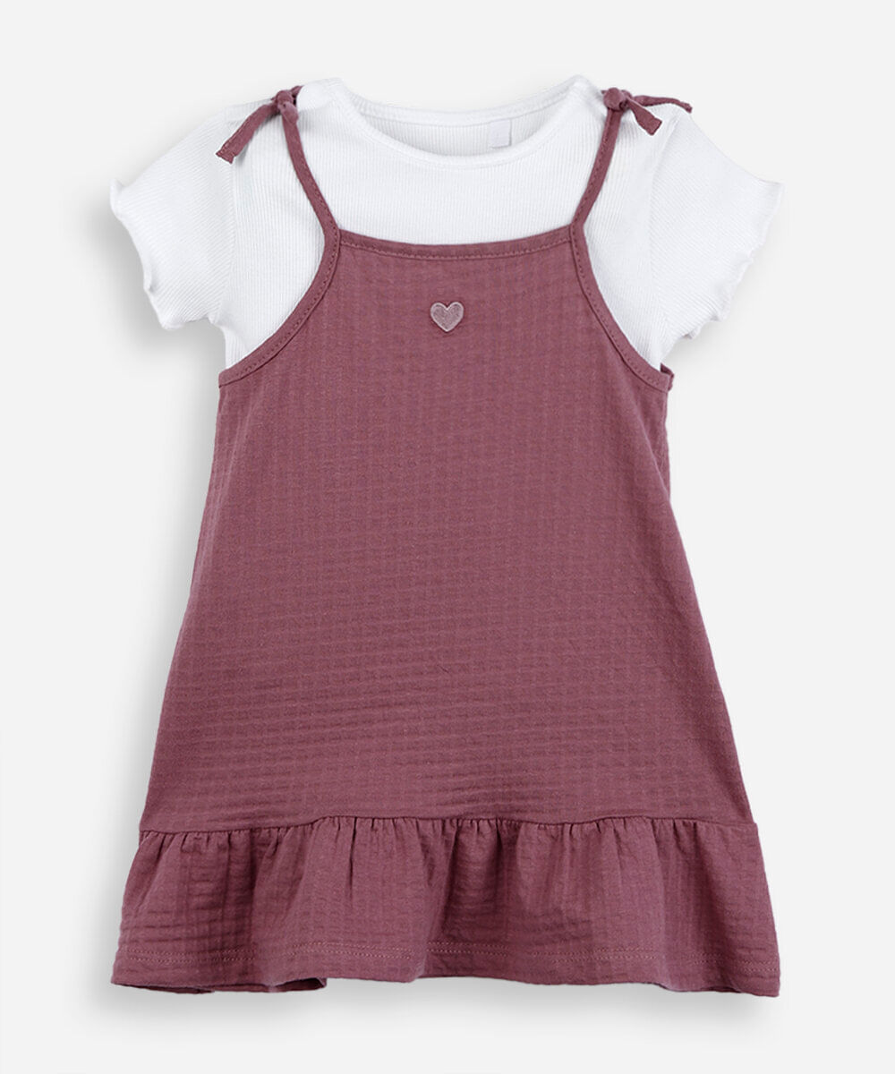 Vestido infantil confeccionado em algodão de toque texturizado. A peça tem modelagem evasê, caimento solto e comprimento midi. Possui decote reto, alças finas com detalhe de laço aplicado, estampa de coração bordado na parte frontal, barra aplicada com efeito de babado e acabamento pespontado. Acompanha blusa em malha canelada com decote redondo, mangas curtas com barra em frufru, caimento reto e acabamento pespontado. Composição: 97% Algodão 3% elastano - Lavar à temperatura máxima de 40ºC