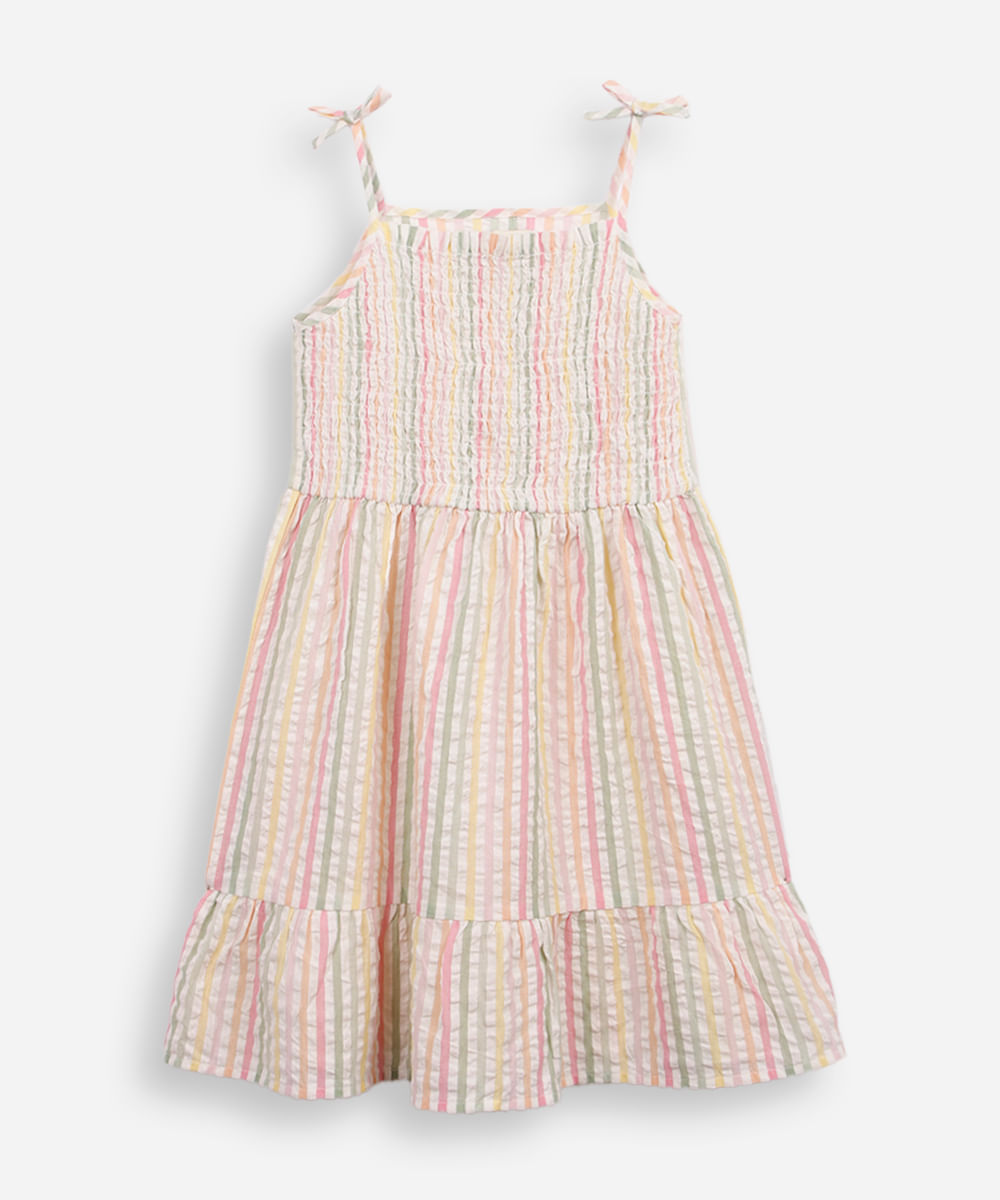 Vestido infantil confeccionado em tecido plano texturizado de algodão com estampa listrada vertical. A peça tem modelagem godê, com lastex aplicado em todo o contorno superior formando franzidos, caimento rodado e solto ao corpo e recorte inferior formando babado. O modelo tem decote quadrado, alças finas com laços e acabamento pespontado na barra.