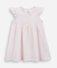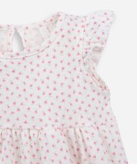 Vestido infantil confeccionado em malha de algodão com estampa floral. A peça tem modelagem godê com caimento rodado e solto ao corpo. O modelo tem decote redondo, abertura posterior por botão e mangas curtas formando babados. Detalhe de acabamento pespontado na barra.