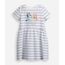Vestido infantil confeccionado em malha macia de algodão com estampa corrida listrada e estampa localizada do desenho Bluey na parte frontal. A peça tem modelagem godê, com recorte formando franzidos e caimento rodado e solto ao corpo. O modelo tem decote redondo em malha canelada e mangas curtas. Detalhe de acabamento pespontado nos punhos e na barra.