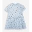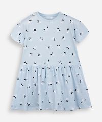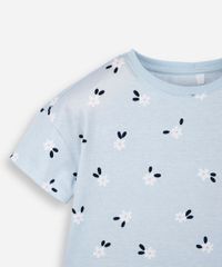 Vestido infantil confeccionado em malha de algodão com estampa floral. A peça tem modelagem evasê, caimento rodado e solto ao corpo. O modelo tem decote redondo e mangas curtas. Detalhe de acabamento pespontado na barra.