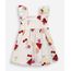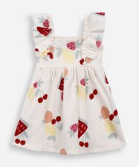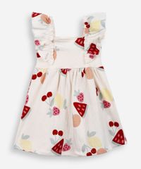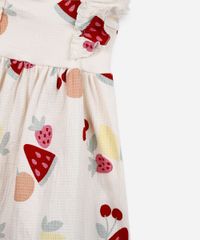 Vestido infantil confeccionado em algodão de toque texturizado. Possui modelagem evasê, comprimento midi, caimento solto, mangas curtas feitas em babados franzidos decorando o busto, decote reto, busto com recorte ajustado, detalhes com estampa de frutas e acabamento pespontado.