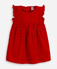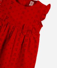Vestido infantil confeccionado em tecido laise com bordados vazados. A peça tem modelagem evasê e caimento solto ao corpo. O modelo tem decote redondo, abertura por botões e mangas curtas. Possui laços na parte frontal, forro em malha e acabamento pespontado na barra.