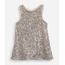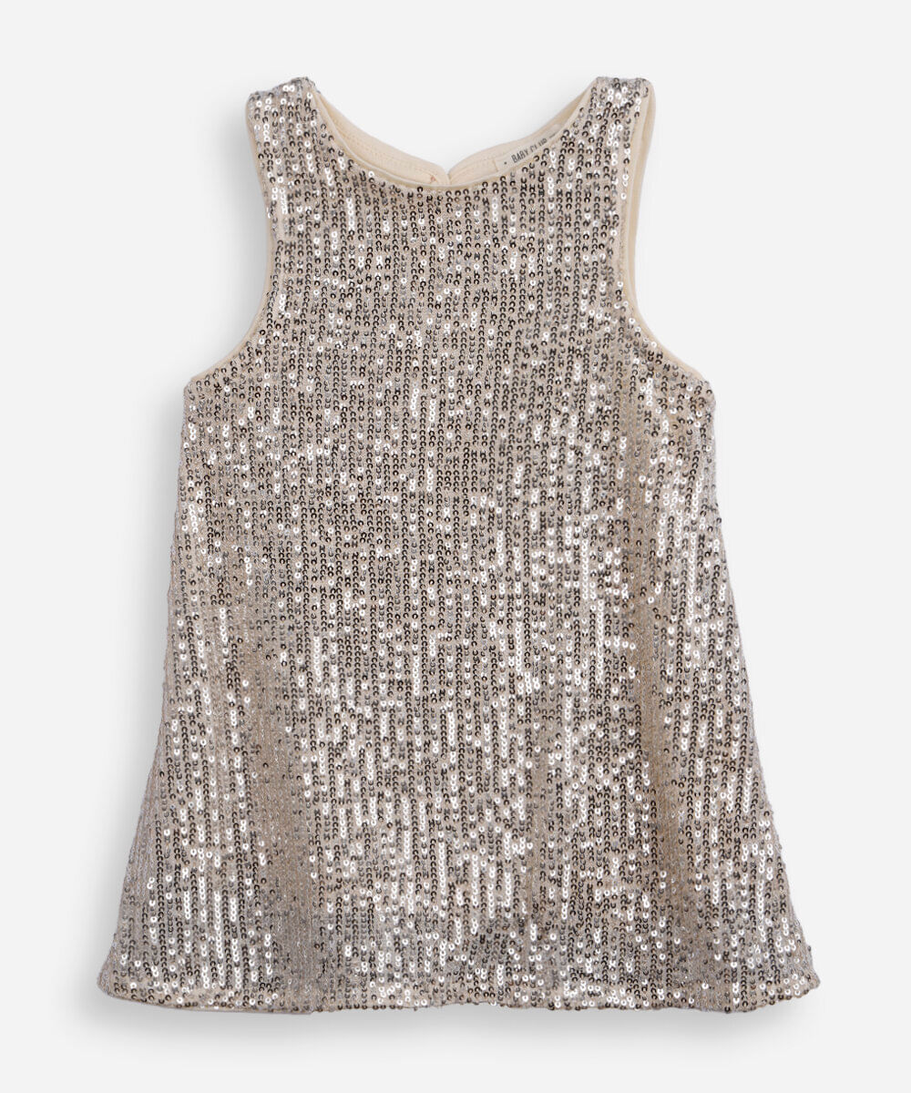 Vestido infantil confeccionado em malha com bordado de paetês. a peça tem modelagem evasê e caimento solto ao corpo. O modelo tem decote redondo, abertura posterior por botão e alças largas.
