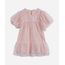 Vestido infantil confeccionado em tule com bordados de paetês. A peça tem modelagem evasê, caimento rodado e solto ao corpo com recorte inferior formando franzidos. O modelo tem decote redondo, abertura posterior por botão e mangas curtas bufantes. Possui forro e acabamento pespontado na barra.