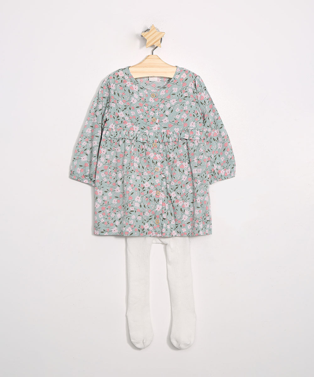 Vestido infantil feminino desenvolvido em tecido plano de viscose estampado floral. Possui recorte na cintura com aplicação de babado. O fechamento é frontal por botões. As mangas são longas com elástico embutido nos punhos e o decote é redondo. Acompanha meia calça desenvolvida em malha.