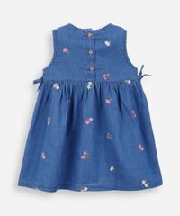 Vestido infantil confeccionado em jeans de algodão. Possui modelagem evasê, comprimento alongado, gola redonda, alças largas, detalhes laterias com laços aplicados, detalhes com bordados de motivos florais bordados ao longo do vestido e fechamento posterior com botões.