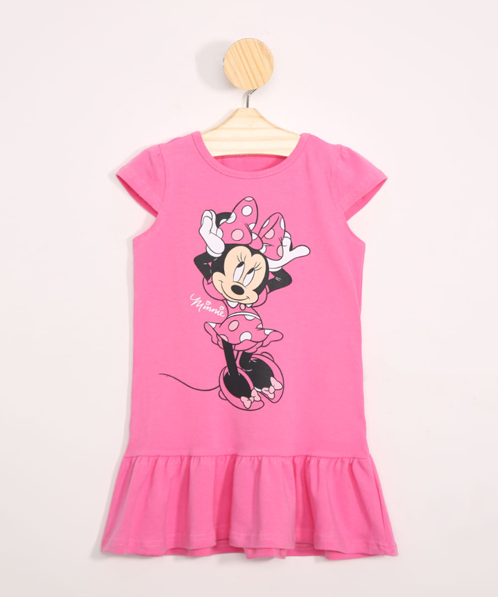 Vestido infantil feminina confeccionado em malha. A peça tem estampa frontal do personagem Minnie. O decote é redondo e as mangas são curtas. A barra tem acabamento em babados.