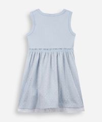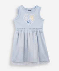 Vestido infantil confeccionado em malha canelada e tule com padronagem poá. A peça possui modelagem evasê, barra aplicada com franzido, decote redondo, alças médias, estampa frontal localizada da personagem do filme Frozen "Elsa" caimento reto e acabamento pespontado.