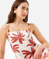 Vestido longo feminino confeccionado em tecido plano de viscose e linho com estampa de folhagens. A peça tem modelagem evasê, caimento reto e solto ao corpo com fenda lateral. O modelo tem decote quadrado e alças finas ajustáveis com miçangas decorativas. Detalhe de acabamento com pesponto na barra.