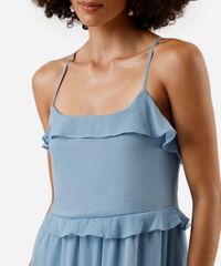 • Decote quadrado com babado aplicado, adicionando um toque delicado e feminino ao visual.