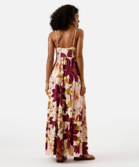Vestido longo feminino confeccionado em tecido plano de algodão com estampa floral. A peça tem modelagem evasê, caimento amplo e solto com recorte inferior formando franzidos. O modelo tem decote quadrado, alças finas ajustáveis e fechamento lateral por zíper invisível.