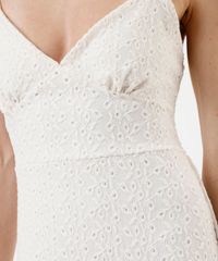 Vestido longo feminino confeccionado em malha laise com bordados vazados. A peça tem modelagem acinturada, caimento rodado e solto ao corpo. O modelo tem decote V, franzidos no busto, alças finas ajustáveis e fechamento por amarração posterior. Possui forro e acabamento pespontado na barra.