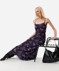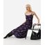 vestido longo alça fina feminino de tule com franzido floral roxo