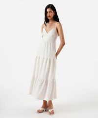Vestido feminino confeccionado em malha de laise com padronagem floral vazada e toque macio. A peça possui modelagem godê com marias e caimento solto, comprimento longo, decote V, alça fina com ajuste, amarração posterior e elástico embutido para maior conforto durante o uso, acabamento pespontado. Esta peça possui forro.