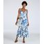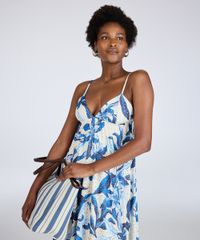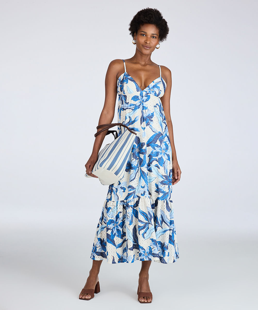 Vestido feminino confeccionado em malha de laise com detalhes vazados e toque macio. A peça possui modelagem godê com marias e caimento solto, comprimento longo, decote V, alça fina com ajuste, padronagem floral em cores contrastantes e acabamento pespontado. Esta peça possui forro.
