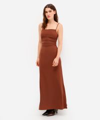 • Modelagem longa e acinturada com franzidos laterais que se ajustam delicadamente ao corpo.