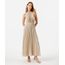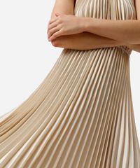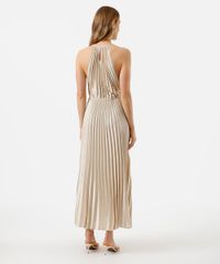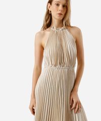 vestido longo feminino halterneck plissado acetinado bege