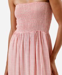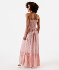 • Modelagem sem alças com decote reto e busto em lastex, que se ajusta delicadamente ao corpo.