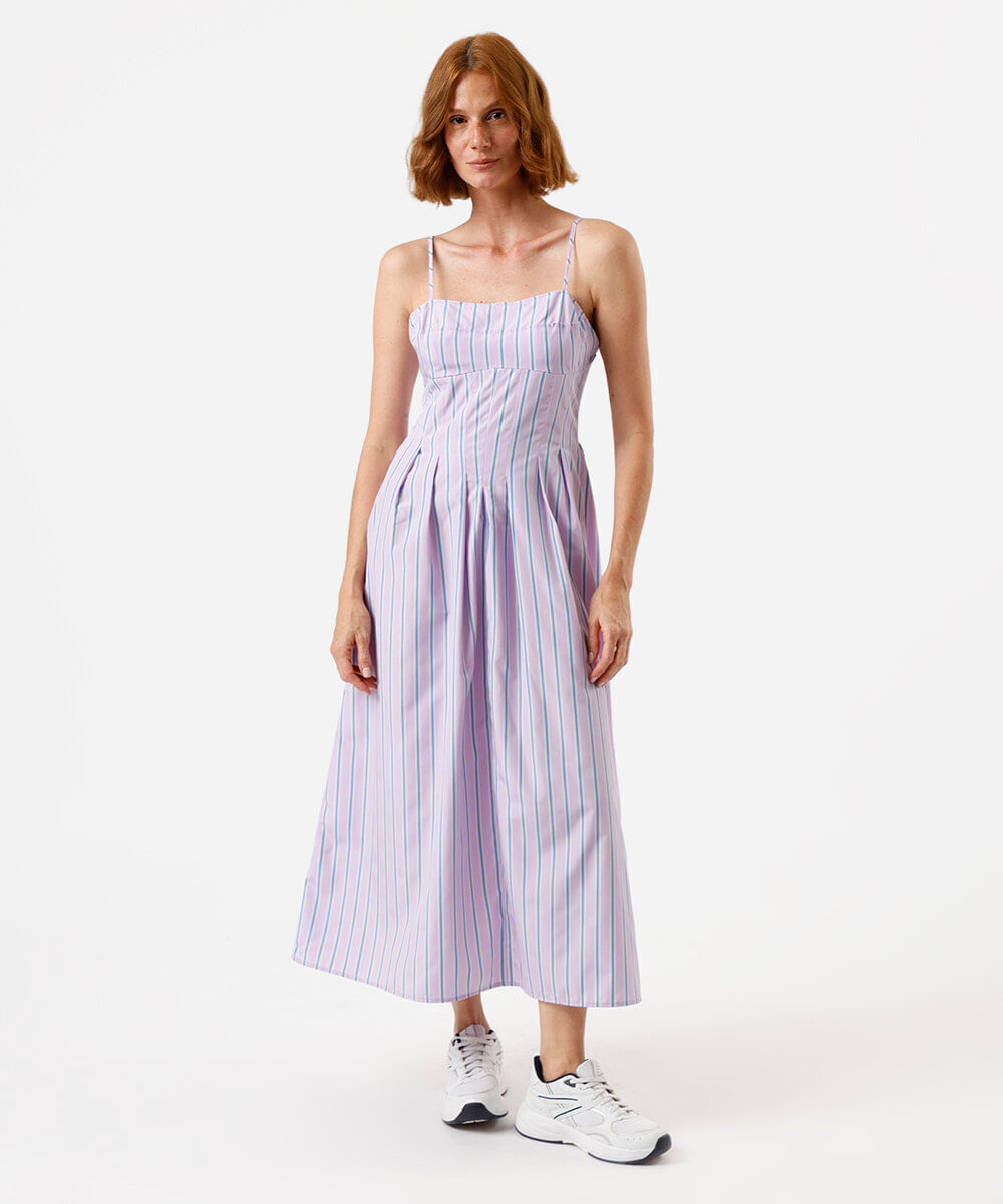 Vestido midi feminino confeccionado em tecido plano com estampa listrada. A peça tem modelagem evasê, caimento rodado e solto ao corpo com pregas frontais. O modelo tem decote quadrado, lastex aplicado na parte posterior, alças finas ajustáveis. Detalhe de acabamento pespontado na barra.
