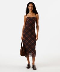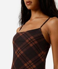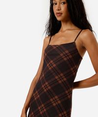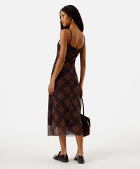 Vestido midi feminino confeccionado em tule de malha com estampa xadrez. A peça tem modelagem tubinho com caimento reto e levemente ajustado ao corpo. O modelo tem decote quadrado e alças finas ajustáveis. Possui forro em malha e acabamento a fio na barra.