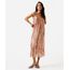 Vestido midi feminino confeccionado em tecido plano com estampa abstrata. A peça tem modelagem evasê, caimento amplo e solto ao corpo. O modelo tem decote V com argolas metálicas aplicadas e alças finas duplas. Possui forro e acabamento pespontado nas barra.