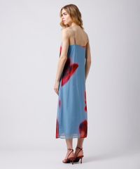 Vestido midi feminino confeccionado em tecido chiffon com estampa floral. A peça tem modelagem evasê, caimento reto e solto ao corpo. O modelo tem decote quadrado, fechamento lateral por zíper invisível e alças finas ajustáveis. Possui forro em malha e acabamento pespontado na barra.