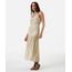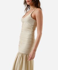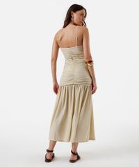 Vestido midi feminino confeccionado em malha. A peça tem modelagem acinturada, caimento ajustado ao corpo com franzidos que modelam a silhueta. O modelo tem decote V, alça finas ajustáveis e forro em malha. Detalhe de acabamento pespontado na barra.