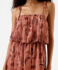 Vestido midi feminino confeccionado em tule de malha com estampa de folhagens estilizada. A peça tem modelagem balonê, caimento acinturado com volume e franzidos. O modelo tem decote quadrado, alças finas com ajuste por amarração e forro em malha.