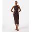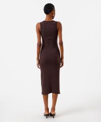 Vestido midi feminino confeccionado em malha de algodão. A peça tem modelagem acinturada com caimento ajustado ao corpo. O modelo tem decote redondo e alças largas. Detalhe de acabamento com viés canelado nas cavas e decote com pesponto na barra.