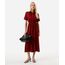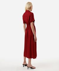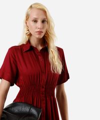 Vestido midi feminino confeccionado em tecido plano de viscose. A peça tem modelagem chemise, com caimento acinturado, reto e solto ao corpo e lastex aplicado formando franzidos. O modelo tem gola esporte, fechamento por botões em vista e mangas curtas. Detalhe de acabamento pespontado na barra.