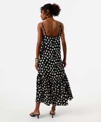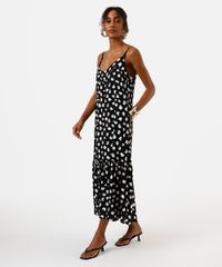 Vestido midi feminino confeccionado em tecido plano leve de viscose com estampa em animal print. A peça tem modelagem evasê, caimento amplo e solto ao corpo com recorte inferior formando franzidos. O modelo tem decote V, alças finas ajustáveis e acabamento pespontado na barra.