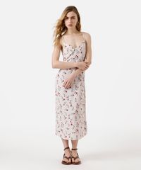 vestido midi feminino alça fina com fenda floral bege