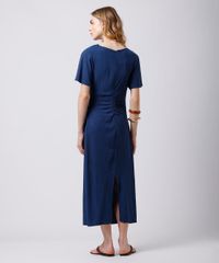 Vestido midi feminino confeccionado em tecido plano de viscose e linho. A peça tem modelagem acinturada, caimento reto e solto ao corpo com pregas laterais que modelam a silhueta. O modelo tem decote redondo, fechamento por zíper invisível e mangas curtas. Possui fenda na parte posterior e acabamento pespontado na barra.