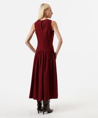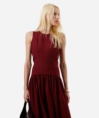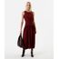 Vestido midi feminino confeccionado em tecido plano com viscose. A peça tem modelagem acinturada, caimento rodado e solto ao corpo com recorte que modelam a silhueta e formam franzidos. O modelo tem decote redondo, abertura por botão posterior e acabamento pespontado na barra.